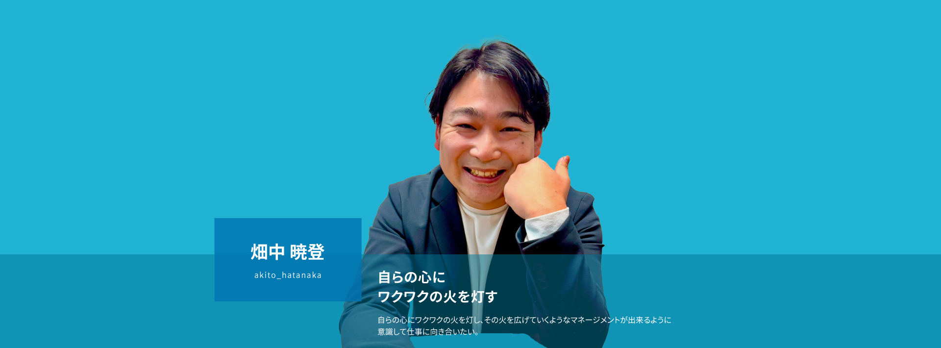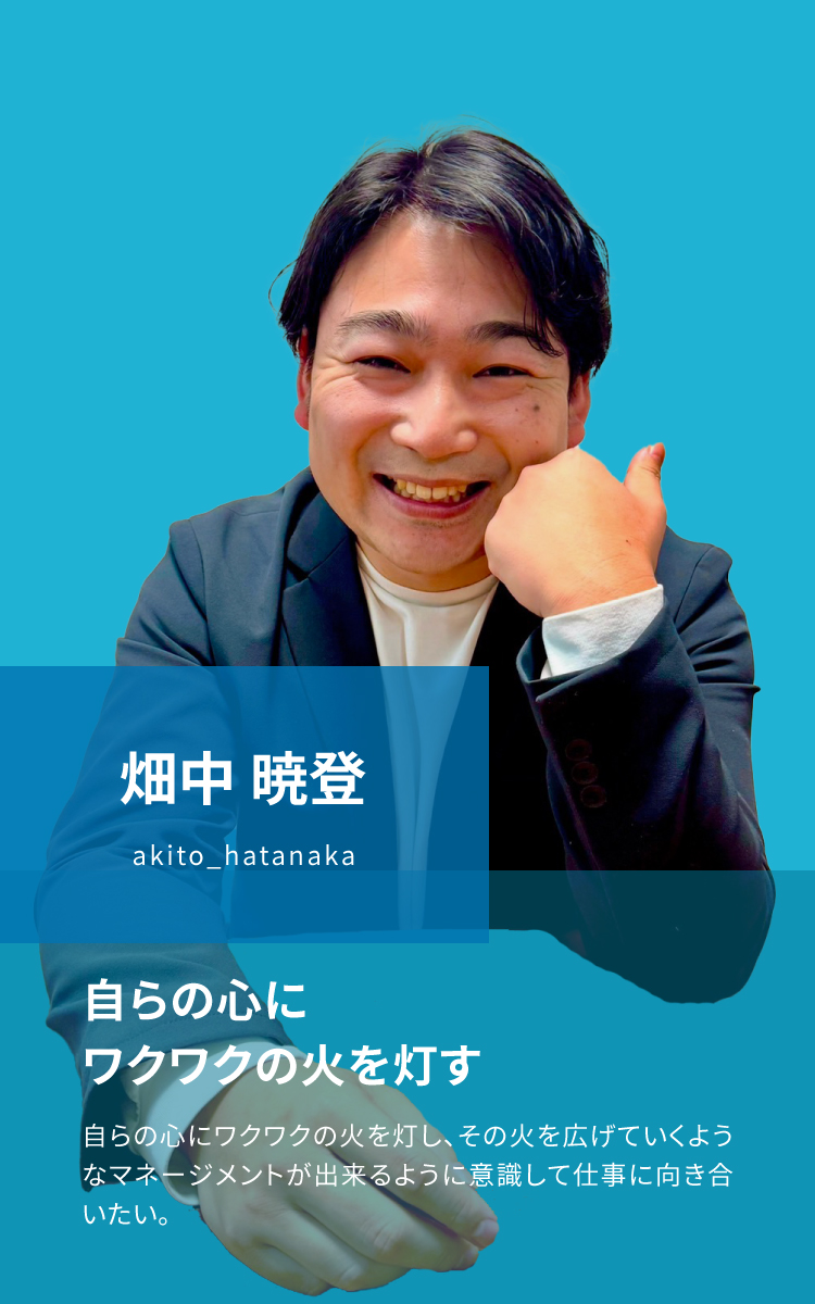 私は、これまでの会社や上司、お客様に、課題解決力を伸ばしていただく機会に恵まれていました。ロジカルに考え正解を見つけていく、または正解とされている回答を淡々とこなしていくようになっていました。「話をよく聞き、最適解を答える」だけのティーチィングから、今度は自らの心にワクワクの火を灯し、その火を広げていくようなマネージメントが出来るように意識して仕事に向き合います。