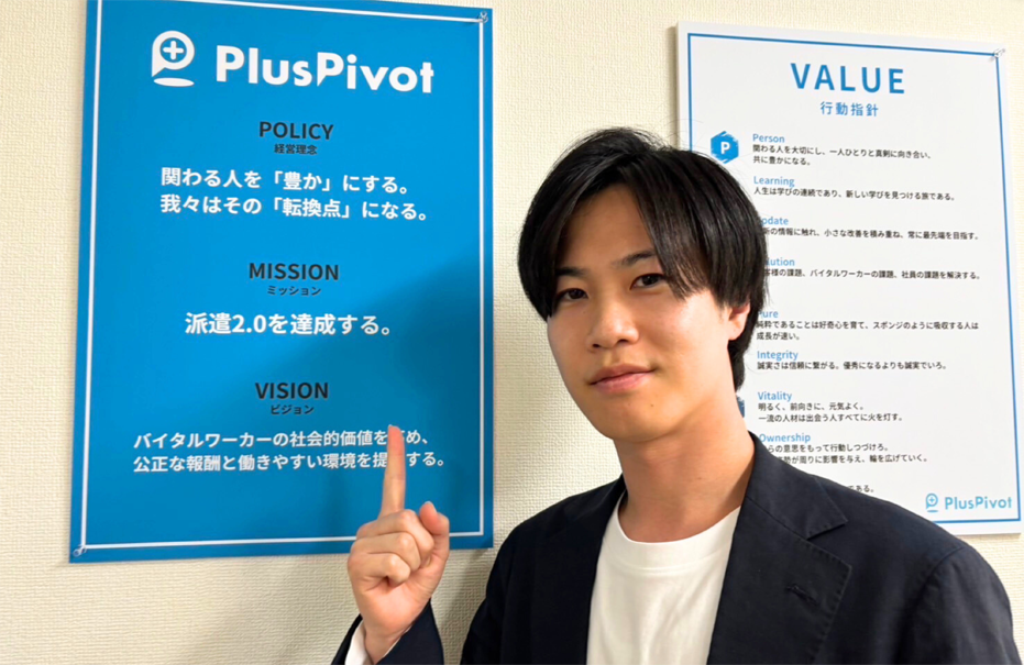 大分県出身。大学卒業後は紳士服の販売員として日々の接客をする中で、「もっとお客様と継続的な関係性を築ける仕事がしたい」と強く感じ、人材業界への転職を決意。大手人材派遣会社で派遣営業としての新たなキャリアをスタート。その後、山本社長との出会いをきっかけに2023年11月、株式会社プラス・ピボットへ入社。福岡オフィスの立ち上げに携わり、現在も同オフィスにて介護派遣営業として勤務。
