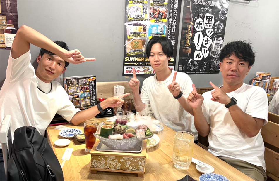 美味しいものを食べに行くことです!僕、本当によく食べるんですよ(笑)無我夢中で食べている瞬間が一番幸せですね。先日は山本社長が福岡へ出張で来てくださった際、福岡オフィスのマネージャーと3人で魚料理をいただきました。美味しい食事を囲みながら仕事やプライベートの話に花が咲き、とても充実した時間でした。