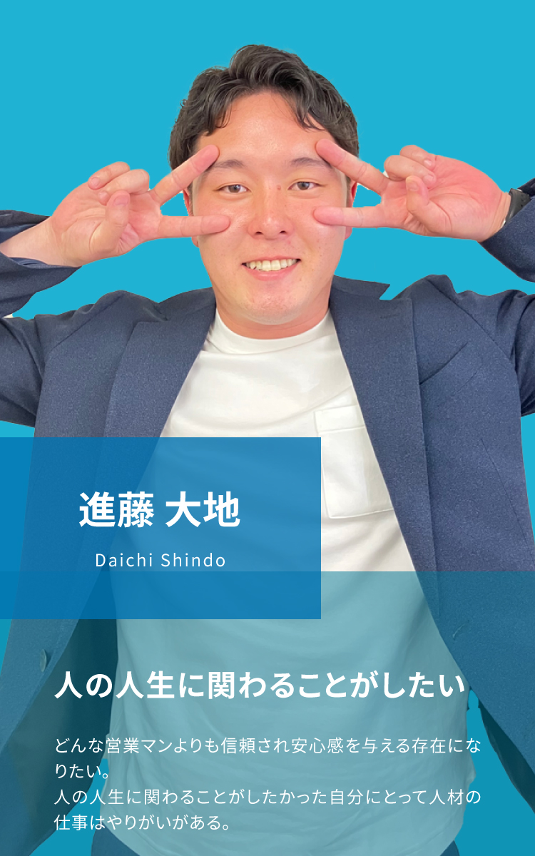 教員になるという夢を持つ中で、介護施設での実習がありました。そこで感じたのは介護の仕事の大変さだけでなく人材不足も強く感じました。自分一人が現場に入っても大した活躍はできないと思い、働きたいと思っている方と働いてもらいたいと思っている企業との架け橋になりたいと思いました。人の人生に関わることがしたかった私にとって人材の仕事はやりがいがあります。