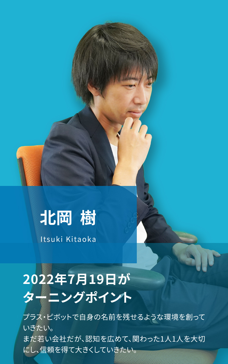 今までは完成された組織に所属し、予算を与えられ、目標を与えられる中で仕事をしてきましたが、自身の名前を残すことが出来る環境を創ろうと考え、この度プラスピボットに参画いたしました。