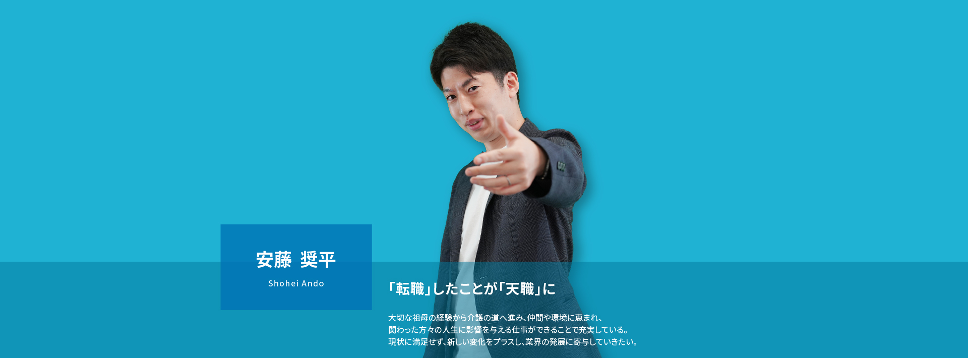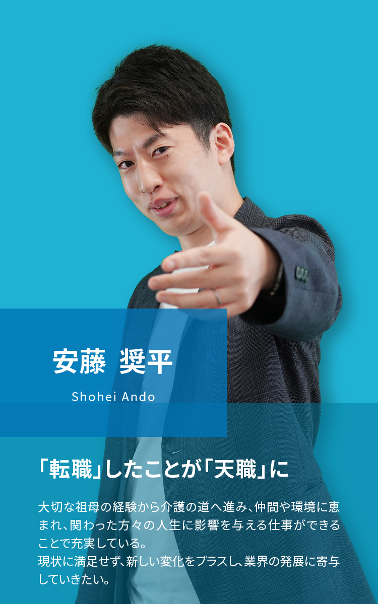 人の人生に影響を与える仕事がしたいと転職を考える中、大切にしている祖母が新型コロナウイルスの影響を受け、なかなか介護施設に入れないと耳にしたことが介護の派遣営業の道を選んだきっかけになります。仲間・環境に恵まれ、「転職」したことが「天職」になり、お客様・求職者の方の人生に影響を与えることができ充実しております。