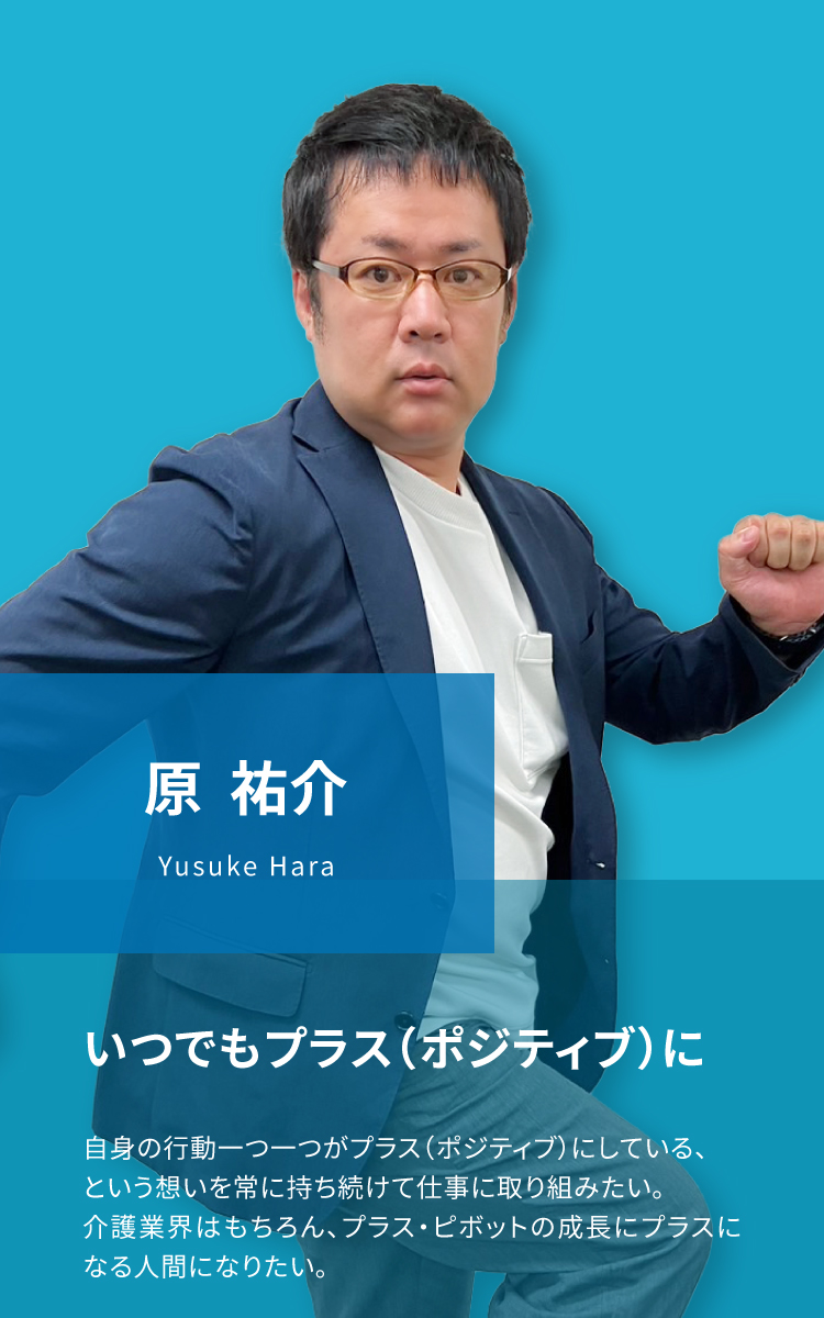 プラス・ピボットの成長はもちろん、自身が対応する一つ一つが「介護業界をプラス(ポジティブ)にしている」という想いをもって仕事に取り組んでいます。